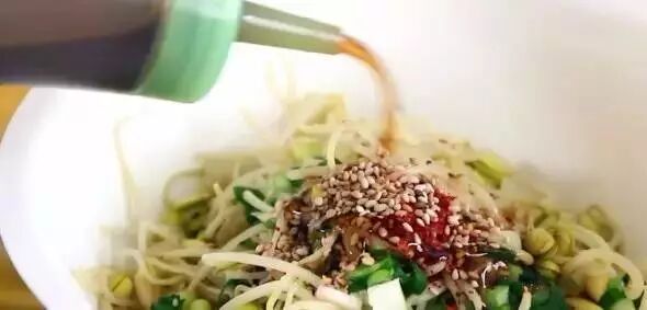 2.香油、陈醋各一匙,辣椒油、蒜蓉各半匙,生抽两匙,少量糖加在豆芽上,拌匀后撒上熟芝麻就行啦~