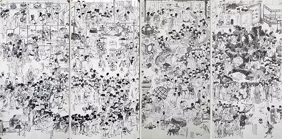 这是一个怎样的历史时刻呢?这是一个历史的分岔路口,中国失去了走上资本主义道路的机会。当然,身处其中的人不会意识到这对此后五百年的历史意味着什么,在这个定格的瞬间里,只有华灯初上的金陵城,赏花看灯的游人,嬉戏玩耍的孩子……“这种婴嬉图的图像范式在中国绘画和视觉文化中究竟代表了什么?”邱志杰在接受《生活》杂志采访时说,“我想是粉饰太平……虽然画面的内容是欢快的,我却总因为它的欢快而感到沉重。”