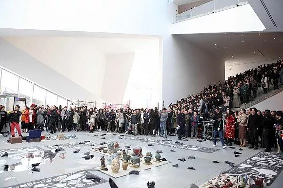 表演开始的时候,一层展厅和楼梯上已经或站或坐地装下了四五百人,众声喧哗的场面正像是《上元灯彩图》上那场五百年前发生在夫子庙前的灯会。邱志杰在接受《艺术新闻中文版》采访时表示,他很反感“白盒子”(即以英国伦敦著名画廊“白立方”为代表的一种展览空间),“任何东西放进一个四白落地的雪白空间,射灯打上去大家都会认真对待,其实观众是被美术馆的权力裹挟着,以至于还没走进一件作品就已经被吓住了,启动了皇帝新衣的效果。……这场展览会让你没有办法清静地看一件作品,永远会同时看到一堆东西,所有的东西都互为背景、互相渗透,就像庙会的感觉,乱糟糟的市场,这个展厅也是同样一种气质。”