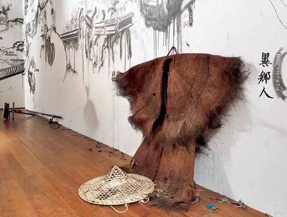 于是在“渔翁”这件装置中,斗笠的竹叶上画着世界地图,蓑衣上嵌满了钩子,鱼竿的钓钩则被一块磁铁取代,它可以吸起散落在周围的钥匙——“渔夫”就是这样一个胸怀世界,并企图掌握钥匙(权力)的人。