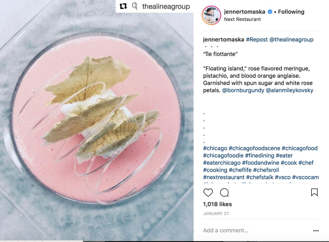 Jenner的Instagram充斥了高级料理里新菜品的设计和摆盘,包括如何将白玫瑰叶糖化脆化进行甜品的摆盘和设计,如何用橄榄制造出鱼鳞感等。是西餐料理厨师非常好的借鉴学习源泉。