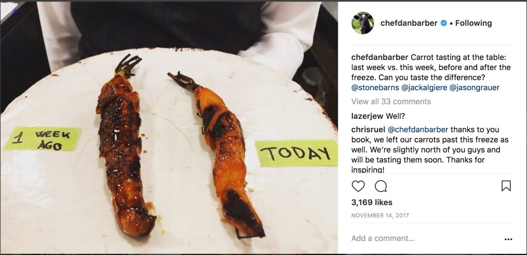 Dan Barber是美国农场到餐桌运动的领军厨师,也是《主厨的餐桌》这个纪录片第一季的主要厨师之一。在Dan Barber的instagram世界里,食材的挖掘和对比是主题。比如同一种鸡喂不同的饲料产出的蛋有什么区别,胡萝卜冷冻一周和新鲜的对比火烤之后味道有什么区别,等等。在Dan Barber的世界里,你可以看到一个伟大的厨师脑回路到底有多少种开启方法,他到底在测试什么?我们对于食材和味道的追求,还有哪些可以借鉴学习的地方。