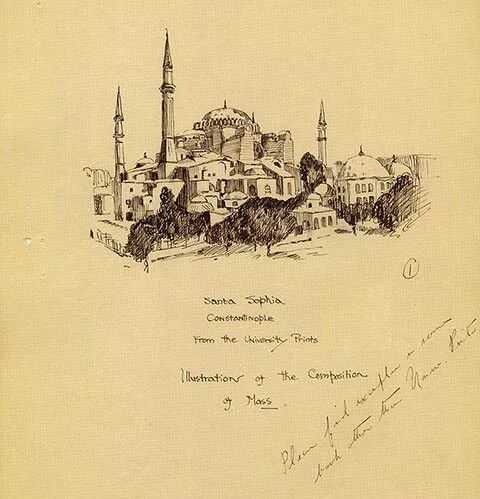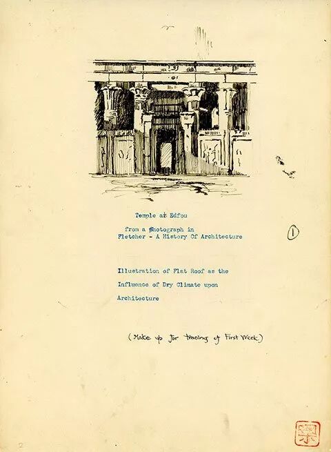 图上均注有英文建筑名称标题,有时夹杂意大利文和法文原词,部分注明原图出处——主要依据书籍插图临摹而得,少数参考照片绘成。其中提到的书名有《弗莱切尔建筑史》、《建筑》、《雕塑艺术》、《宫殿建筑》、《意大利艺术》等,还有一张《君士坦丁堡圣索菲亚大教堂透视图》源自学校的一份印刷品。有一张图绘有古埃及埃德夫神庙立面,梁思成特意在图纸下方标注了一句话:“补第一周摹图”。