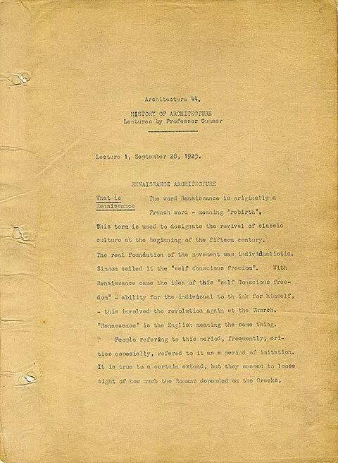当时在宾大主讲建筑历史课的教授名叫阿尔弗雷德·H.·古梅尔(Alfred H. Gumaer),课程编号为“建筑44”。梁思成听课认真,课后将笔记全部整理成英文打字稿,至今尚存35讲,时间是1925年9月28日至1926年3月22日。