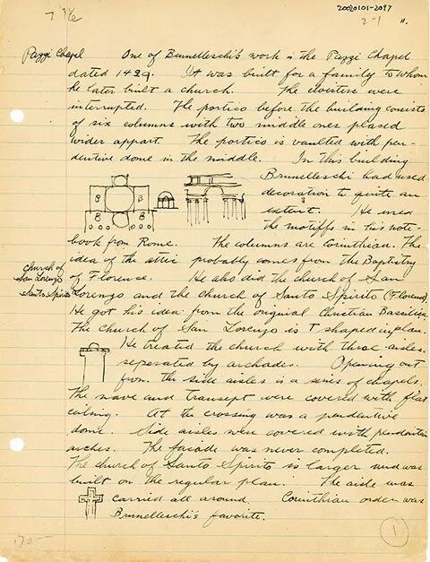宾夕法尼亚大学的建筑学教育与巴黎美术学院渊源极深,属于典型的“鲍扎”体系,非常重视古典训练和建筑史修养的培育。按照课程要求,学生需要在课后摹画经典建筑的图像,与课堂笔记一同交老师批阅。