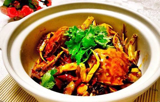 5.加入调好的排骨酱汁,放螃蟹入锅翻炒均匀,焖八分钟左右
