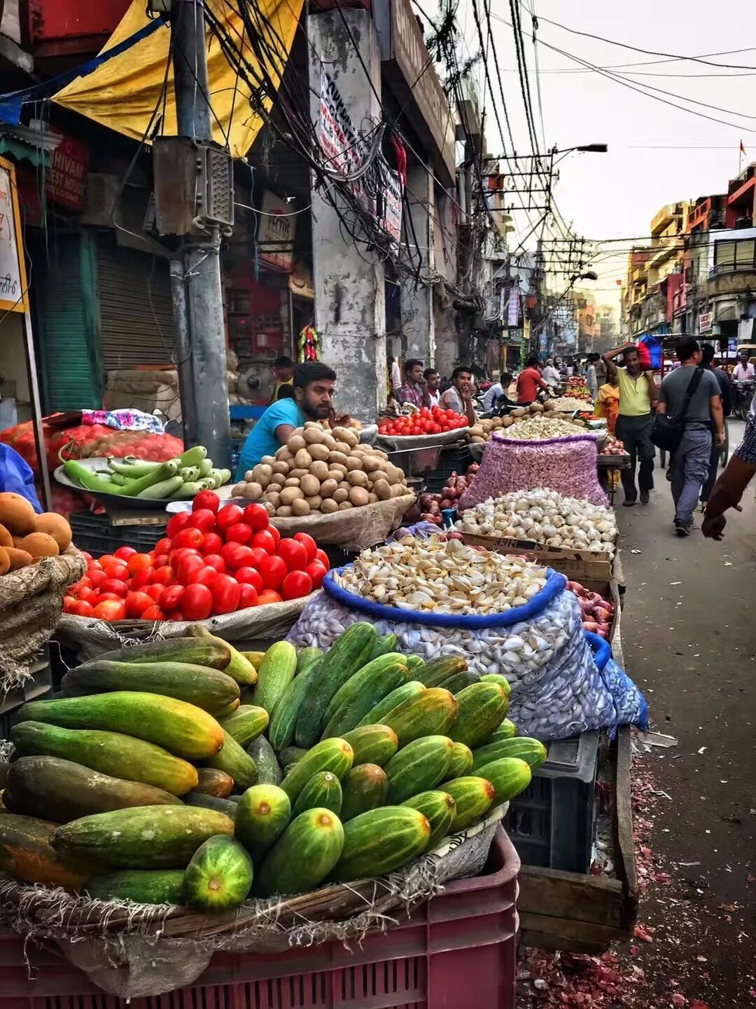 印度的菜场就更有自己的个性了脏乱差是关键词,除了人车摊位,还有神牛,牛粪,马羊等各种牲畜。女性几乎不会出现在市场,安全是一个很大的问题。但与此同时,这个具有悠久历史的城市建筑和人们的传统服饰又给菜市场一个别样的历史沉淀感,即使脏乱差,人们也似乎在这样的混乱里找到了平衡和规则,一切在自己的法则里运转。