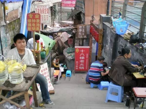 二十年前的十八梯,只有摆在街沿的火锅摊子,九宫格可以让九个人围起吃,一人一格,大路朝天各走半边,江湖两清各不相欠。逢雨天,隔会儿老板就要拿根竹竿出来撑一撑食客脑壳顶上的塑料布,让兜住的积水倾泻出去,坐在边边的人一边捞菜一边缩脚。