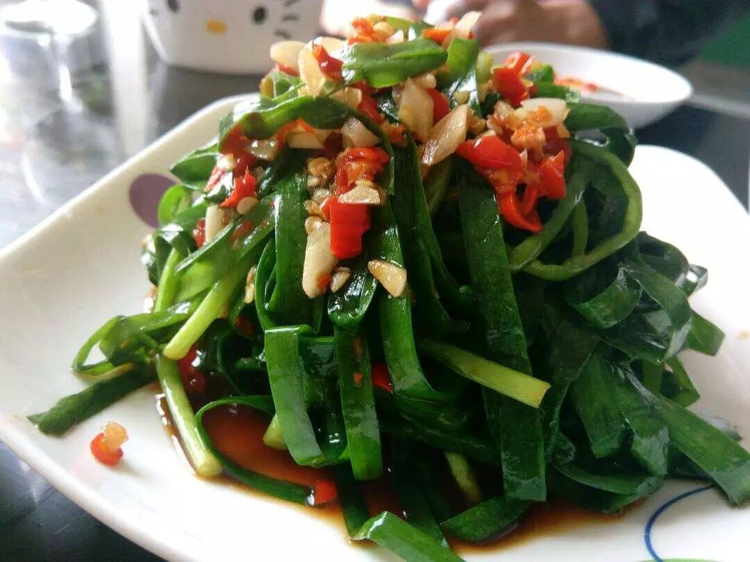 大火烧开,韭菜从根部开始放入水中,烫到整个都软了就夹出切段,放些酱油蚝油拌匀,淋上麻油,轻松完成。入口,先是口感的脆嫩,然后是调料的咸鲜,再是特殊的辛辣,最后生出一丝甘甜。此情此景,正好同桌的各位可以举起酒杯互相敬酒,“富贵险中求”,辣味之后更能突出甘甜。