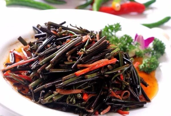 蕨菜别名龙爪菜,全国各地都有,其中以高寒地区的蕨菜味道佳。蕨菜只有在春季恰当,老了之后会很苦。蕨菜的品种众多,可食的就有十几种,但是凭口味来说,仅有两种,在北京的餐馆里可以吃到的大多是甜味的。蕨菜可以做成各种各样的菜品,最简单的是凉拌蕨菜。取蕨菜的根茎,用热水抄一遍,在其中撒上一些辣椒,盐,醋等调味即可,简单方便。蕨菜要是做不好,会有一点苦涩,其实就算做得很好,也会有一点点涩,这种涩或许就是蕨菜的宿命,无法逃离。但是正是这一点点涩,保持了野菜的朴素品质,在众多调料的融合下,舌头的尖部可以挑逗一丝丝的苦涩。