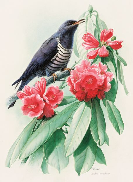 四声杜鹃,选自《云南花鸟》。 画鸟的夙愿达成,曾孝濂又为1999年昆明世界园艺博览会画了“十大名花”。一发而不可收,干脆又回过头接连画了一百多幅花。技术上虽是轻车熟路,但野生花卉可遇而不可求,有时候找花比画花要困难得多。2002年底,《中国云南百花图》出版。 接着,他应邀完成《药用植物画集》,在日本出版发行。并与美籍台湾画家杨恩生、古生物画家侯晋封一起为古鸟类专家侯连海完成了《中国古鸟类》一书的古生态复原图,这批画作完全是义务劳动,他不仅分文未取,连车马费都是自己负担。