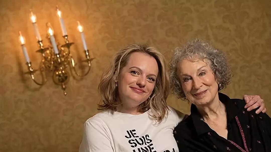 阿特伍德(右)与《使女的故事》女主角的扮演者伊丽莎白·莫斯