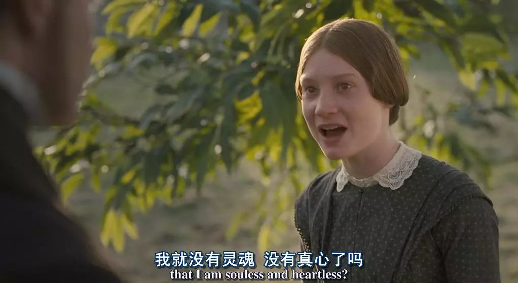 自卑的简·爱并不敢流露出丝毫感情,性情激烈的罗切斯特则故意采取极端手段,激起了简·爱的嫉妒。得知罗切斯特要娶英格拉姆小姐之后,在那个疯狂躁动、雷雨交加的夜里,在庄园里那棵参天的七叶树下,被爱与痛苦逼到绝境的简·爱向罗切斯特呐喊出了那段经典的心灵剖白: