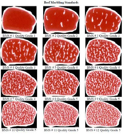 牛肉的肌间脂肪比率,与牛肉的品质有很大关系。以至于像美国、日本等国家,给牛肉分级时,最看重的就是「肌间脂肪比例」和「肌间脂肪均匀度」。