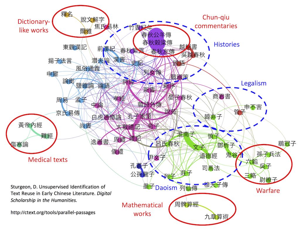 尽管有这些困难,这些年还是有学者另辟蹊径,陆续做出了些有意思的成果来。我拿德龙(Donald Sturgeon)的研究做个例子。德龙还在读博士的时候就凭一己之力做出了一个巨大的线上开放电子图书馆,虽然名字叫作“中国哲学书电子化计划“,但是事实上它收藏了超过三万部中文著作,从先秦到民国,凡所应有、无所不有,总共有五十亿字之多。