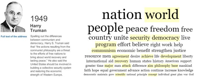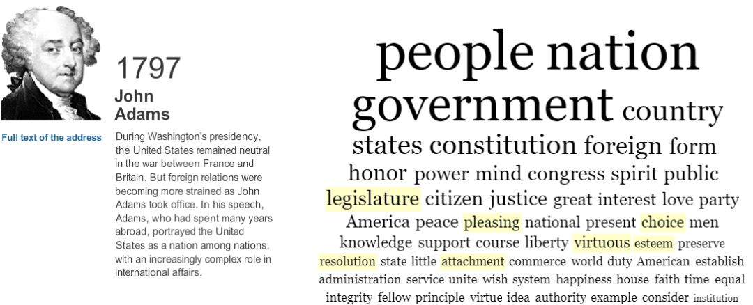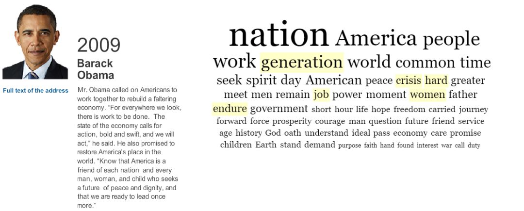 几年前,纽约时报就用这种方法分析了1789年到2009年之间所有美国总统的就职演讲,让读者一目了然地看到在美国200多年的历史进程中,总统关心的核心问题是如何变化的。比如,最早的几位美国总统在就职演说中最常提到的都是跟政治结构、公民权利、公共利益相关的词(如“政府”、“宪法”、“立法机构”、“公民”、“公共”、“义务”、“利益”等)。到了20世纪中叶,美国总统就职时最爱说的则变成了和美国的世界领袖地位及其意识形态相关的词汇(“世界”、“力量”、“自由”等)。20世纪80年代以后,总统就职演说的重点又发生了变化了,他们开始把“工作”、“世代”、“梦想”之类的词挂在了嘴边。
