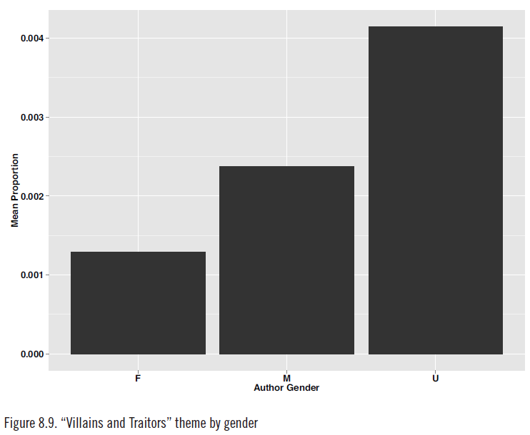 不同性别小说家的作品中“混蛋和叛徒”主题出现的比例(来源:Matthew Jockers, Macroanalysis)