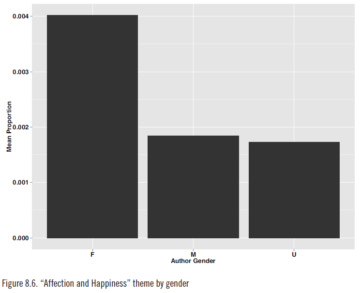 不同性别小说家的作品中“情感与幸福”主题出现的比例(来源:Matthew Jockers, Macroanalysis)