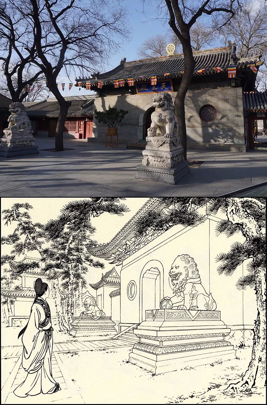 连环画第4图所绘普救寺山门,源自广济寺天王殿以及西侧鼓楼景象,只是两尊石狮子稍向北移,同时其底部须弥座造型略有变化。