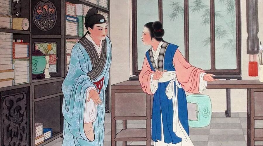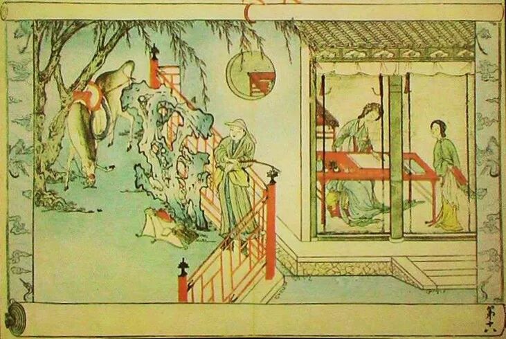 张生一路游赏,赞叹不已。沿回廊来来到经阁北、法堂西、厨房南、钟楼东的一个别院,临近松亭、花溪,有粉墙掩映着几间屋舍。张生在此初见莺莺,魂飞天外。寺僧法聪告诉他:“这一位也非是佛殿,旧来是僧院,新来做了客馆。崔相国家属,现寄居里面。”
