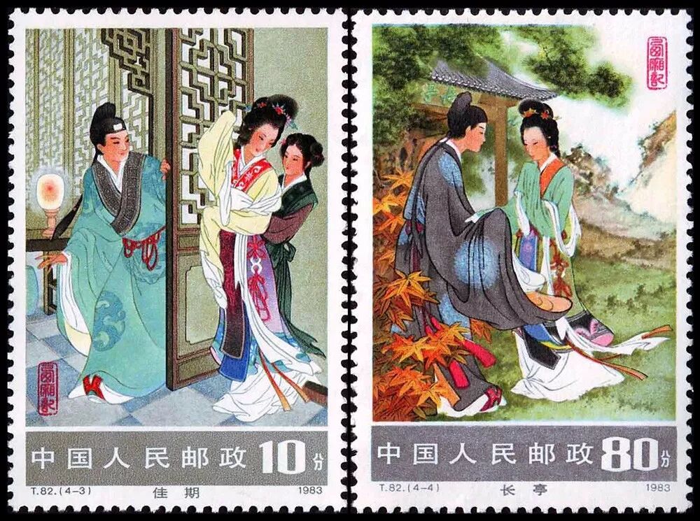 1953年国家颁布新《婚姻法》,为了宣传婚姻自主、反对包办,决定出版《西厢记》连环画。王叔晖受命绘制完成十六幅彩色本,1957年又完成一百二十八幅线描本,被认为是中国连环画史上里程碑式的名作。1980年王叔晖依旧稿重绘四枚《西厢记》邮票,精美之极,1983年正式发行,被评为当年最佳邮票。