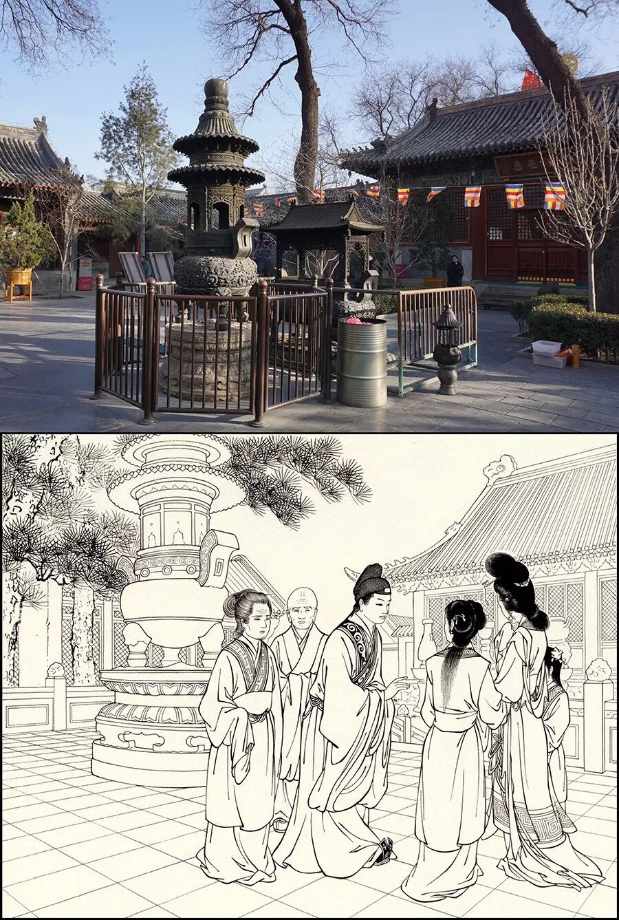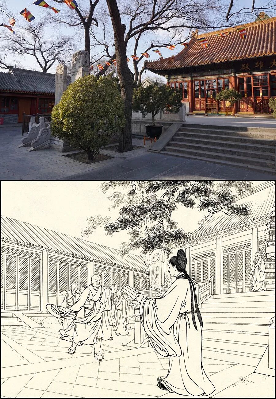 美术界公认王叔晖的仕女画得好,其实她笔下的古建筑同样是一绝。将《西厢记》连环画线描本与广济寺实景对照,很容易发现二者之间的渊源。