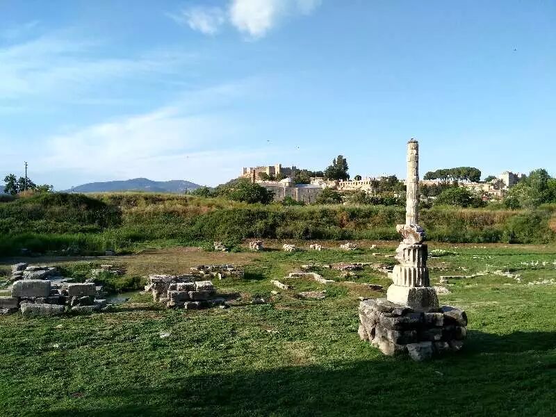 在历史和现实的挤压下,阿尔忒弥斯神庙遗址显然缩小了不少面积。遗址上除了青草,十几块巨石,就剩一根孤零零的圆柱。像这个城市的所有柱状物一样,石柱的顶部居住着白鹳。每年4到9月,成对的白鹳都会飞临此地,在城市的烟囱、路灯和楼顶上筑巢,共同繁育后代,看来阿尔忒弥斯繁育生灵的神力没有完全消失,对此信心尚存的当地人还在遗址上放养着孔雀和鹅群。