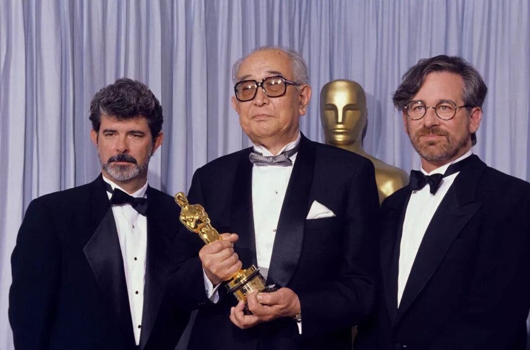 在第62届奥斯卡(1990),乔治·卢卡斯(左)与史蒂芬·斯皮尔伯格(右)为黑泽明(中)颁发“奥斯卡终身成就奖”。 黑泽明还是许多电影界大佬的爱豆, 比如马尔克斯、约翰·福特、马丁·斯科塞斯、北野武、张艺谋……