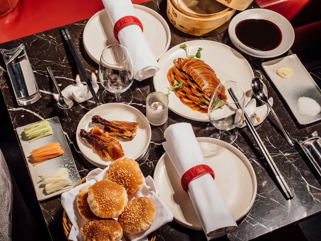 整个制作流程充满着工业流水线的仪式感,从洗膛上叉、烫皮打糖、风干晾胚再到上火烤制,无一处不讲究,无一处不精致。再加上上桌后取面皮,选配料,卷成条的系列动作,整个用餐过程写下来就是一个晚清慈禧进食指南。