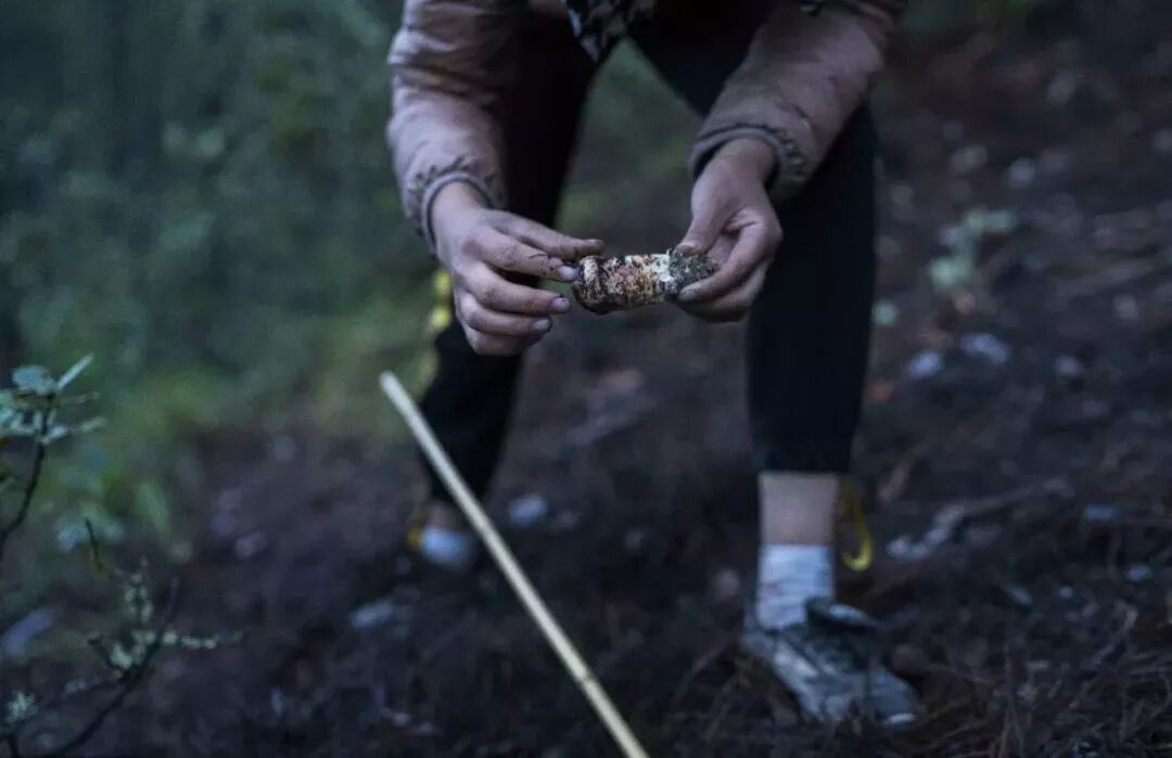 2017年8月,云南迪庆,19岁的格茸吹追在大山深处采摘松茸,她用撬棍插进土里,将松茸撬出来。这枚松茸形态不错,但个头小了点 / 视觉中国