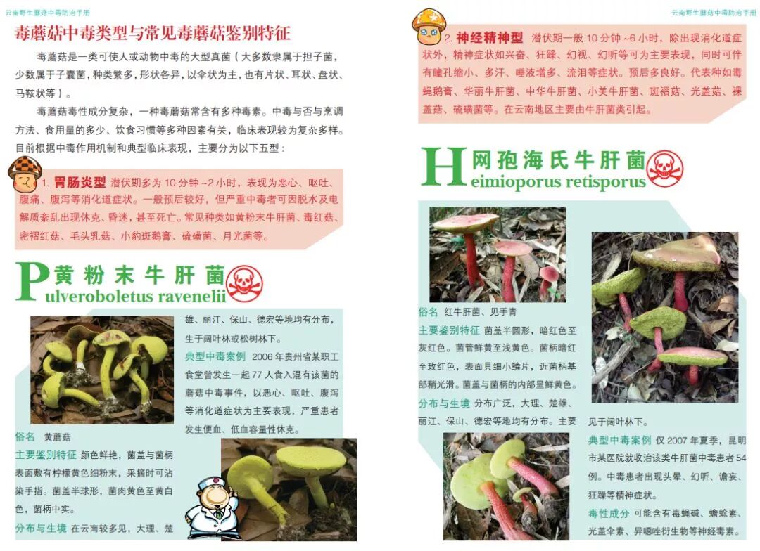 为此,中国疾病预防控制中心和中科院昆明植物研究所还专门出了一个“云南野生蘑菇中毒防治手册”。里面提到了一些有毒的野生菌,其中就有云南四大野生菌之一的牛肝菌的亲戚:黄粉末牛肝菌、网孢海氏牛肝菌等等。