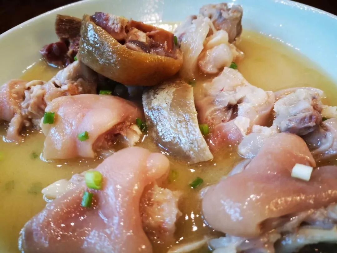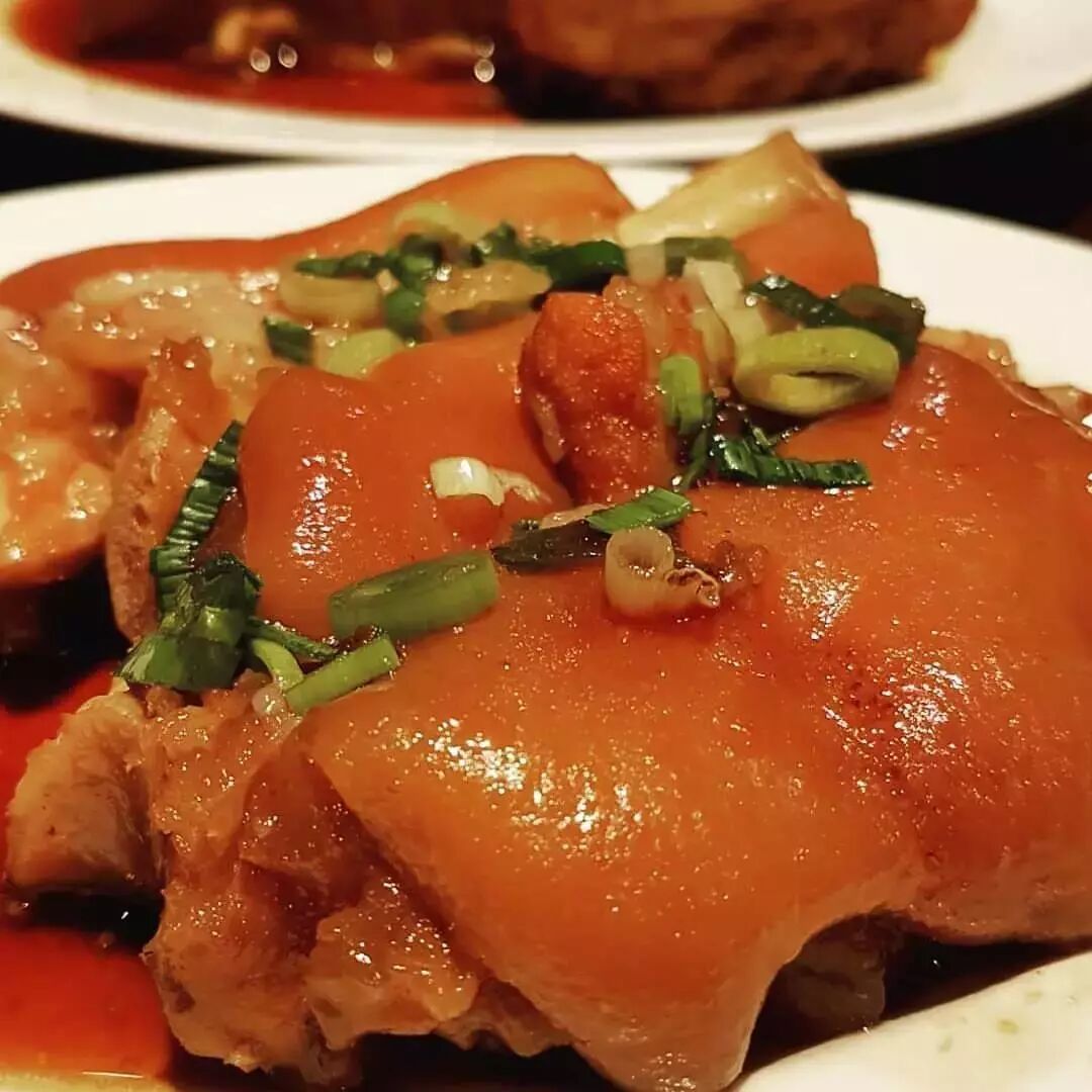 大口的肉,大口的吃,炖的透,把油都炖出来,留下大量的胶质在肉里面,吃起来特别的爽,吃完再后悔胖三斤。图为金银蹄膀。