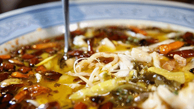 吃酸汤鱼时,要讲究在鱼煮沸但还没下菜和豆腐前,先舀一大勺酸汤兼融鲜鱼汤到碗里来,吹一吹、喝一口,慢慢品,舌尖千万个味蕾都在那一瞬仿佛变成了泡温泉的小人儿,浑身都被按摩到,但又被热汤温柔地包裹住,舒服得熏熏然。明明是喝汤却如喝酒一般“喝嗨了”,说的就是这种美味。
