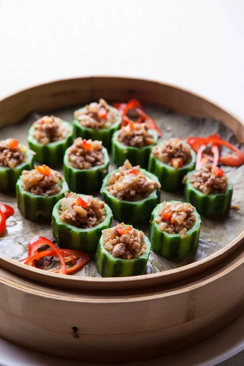 封蒸是将食材(大多数情况下是腊味)置于密闭容器中,再入蒸锅,食材就像进了丹炉的孙悟空,经历大火洗礼,也由此得到了升华;扣蒸的代表扣肉、八宝饭想必各位都不会感到陌生;包蒸顾名思义,是将食材包入蛋皮、荷叶等等材料;酿蒸则是把材料塞入苦瓜、辣椒等中空的菜蔬内蒸熟;造型蒸适用的是那些流质的、必须放在容器里的原料;干蒸最简单粗暴,玉米、花生、土豆等等杂粮直接上蒸笼。