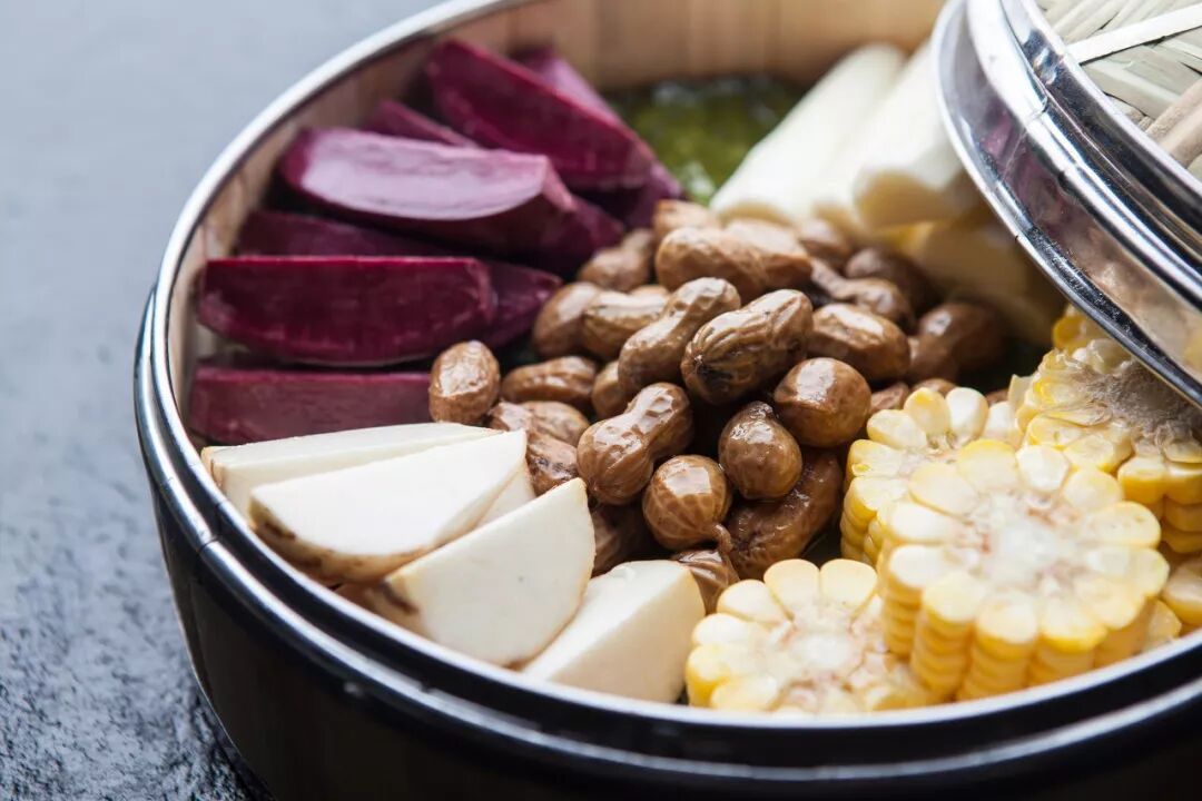 ▲ 干蒸的各色杂粮。只要是块根类的食物,比如玉米、红薯、芋头等等,都可以采用这种方法蒸制。湖北人还为它取了一个很喜庆的名字——五谷丰登。图/图虫·创意
