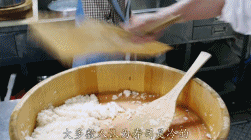 米饭煮完冷却到7成就得倒入桧木桶中搅拌,添加用盐、糖、醋调好的醋,这个比例是每家店的秘方。