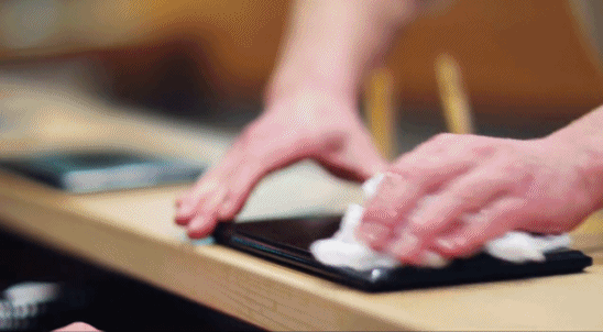90多岁的寿司之神小野二郎会先将米饭在手掌塑形,食指蘸取适量磨好的山葵点在鱼肉上,从各个角度按压,让寿司变得紧实,最后再在鱼的表面刷上调配好的酱油,直接放到客人面前的盘子里,而客人就直接用手拿起寿司来吃。