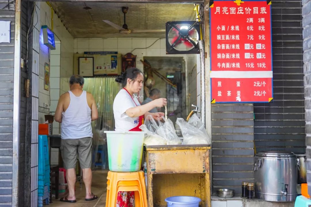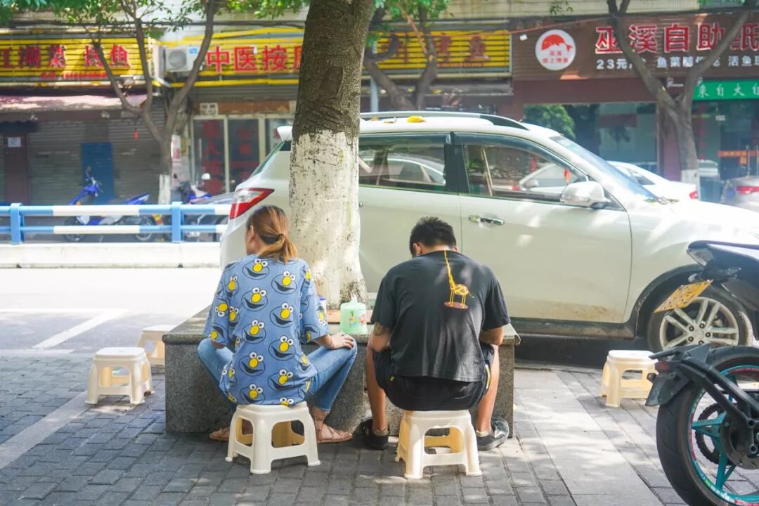 重庆人民的早餐,最常见的就是小面。店里坐不下了,就找根板凳在外面坐着吃。