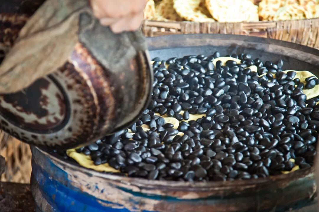 老白家只做石子馍,进门就能看到一锅黝黑锃亮的鹅卵石,底下埋着的馍隐约可见,这种散发着石器时代饮食遗风的面食,是临潼人引以为傲的美食名片。