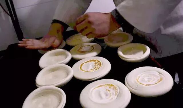 好的白吉馍一定是要醒够时间,醒好的面团在打馍的手里反复摔打上劲,再擀成碗状的中凹造型,一套动作行云流水,极富表演艺术。