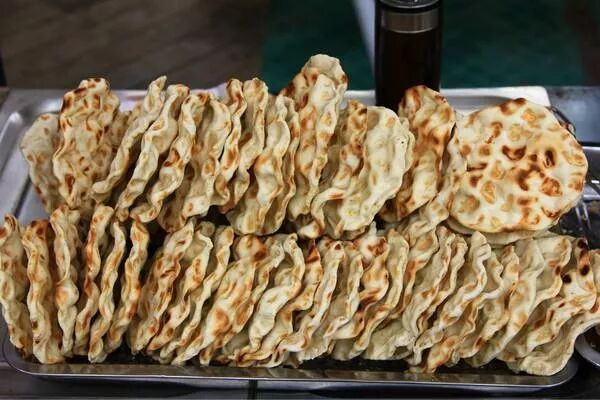 搭配水盆羊肉吃的馍跟羊肉泡馍里的馍有着显而易见的区别。半月形的馍,经过发酵,烤熟之后表面焦黄,中间蓬松,说它是烧饼可能更为贴切。