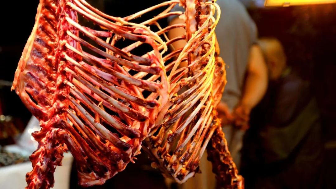 回民街里卖腊牛羊肉夹馍的铺子,通常也卖新鲜牛羊肉。屋梁上挂着刚宰完没多久的整牛全羊,肌肉血红却干爽,散客来了带走少量的腱子或者里脊,更上乘的货色早就被各个烧烤店老板盯上。还剩下一些不足斤的肉,会被扔进深锅里煮熟,炖烂,拿去夹馍。