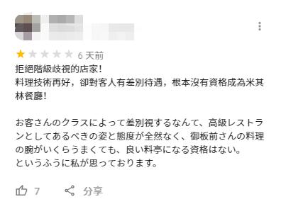 这正是为什么米其林被质疑,是因为评星机制并不能代表我们普罗大众,但很多人就是奔着米其林去的;寿司之神被摘星,也是因为违背了对食客本身的尊重。