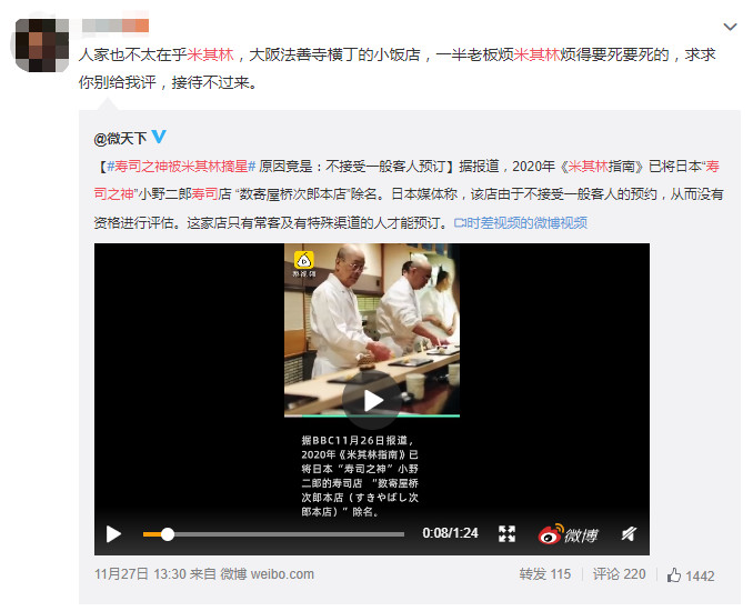 “寿司之神根本不需要米其林三星,摘了也没什么。”很多人吐槽米其林摘星的理由很无力,并不是因为美食本身的质量下降,而是预约订位问题。