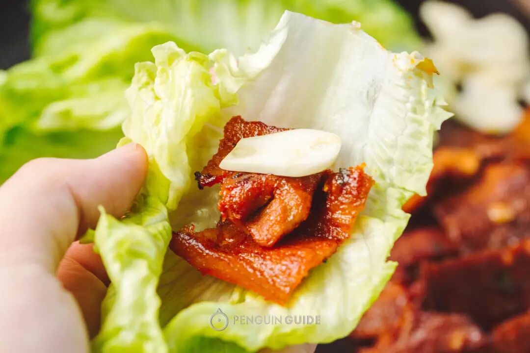 配生菜和大蒜,再加一勺米饭,嘻嘻,东北包饭吃法,我一个人一口气可以干光一盘吧,嗝~~~ 这个配方用来腌鸡翅也超好吃的!