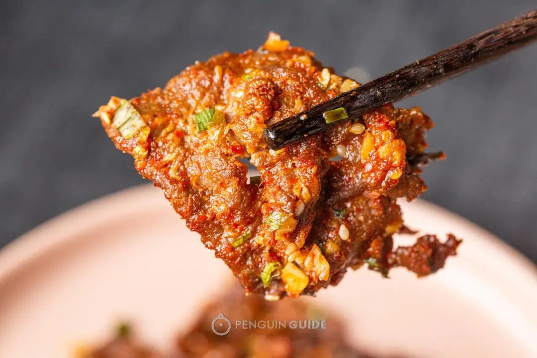 腌好的肉,香料会包裹得很均匀,散发着花椒的麻香和孜然的烧烤味,配酒也很不错,可以媲美冷吃麻辣牛肉。