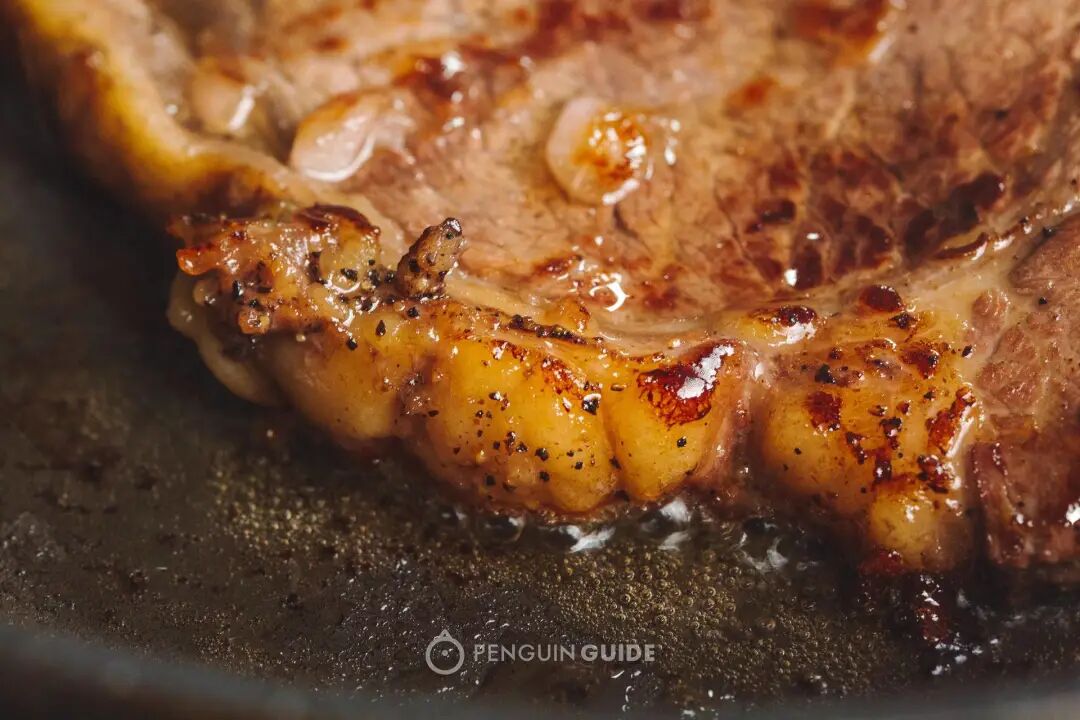 大火油温高下锅煎,一面金黄后再翻面,最后再煎侧面的肥脂部分,煎好后的牛排要静置5分钟后再切,让牛排从滚烫的温度中醒一下,更好吃!