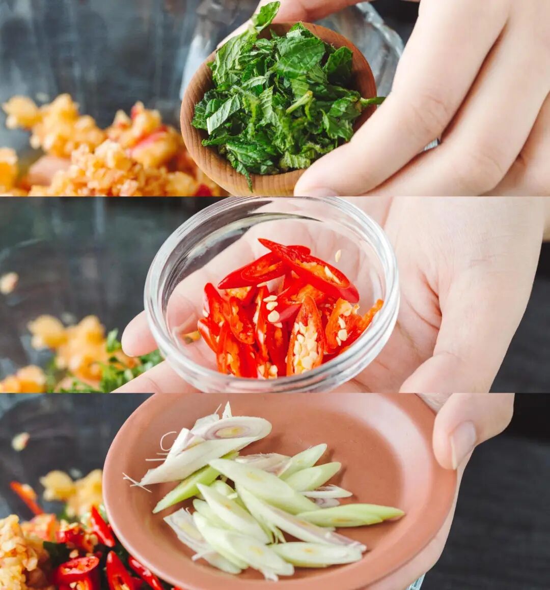 香料是泰式料理的精髓:薄荷叶碎、辣椒段、香茅碎。切完香料,就感到东南亚的海风已经吹在脸上了……香茅如果比较难买,可以省略。