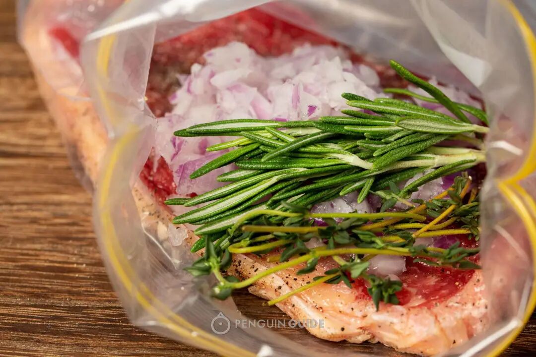 红酒单宁会有点苦涩,需要加入一些糖来平衡,放入密封袋后冰箱冷藏30-60分钟,迷迭香和百里香是最经典的搭配,如果买不到也可以省略,但洋葱不要省!