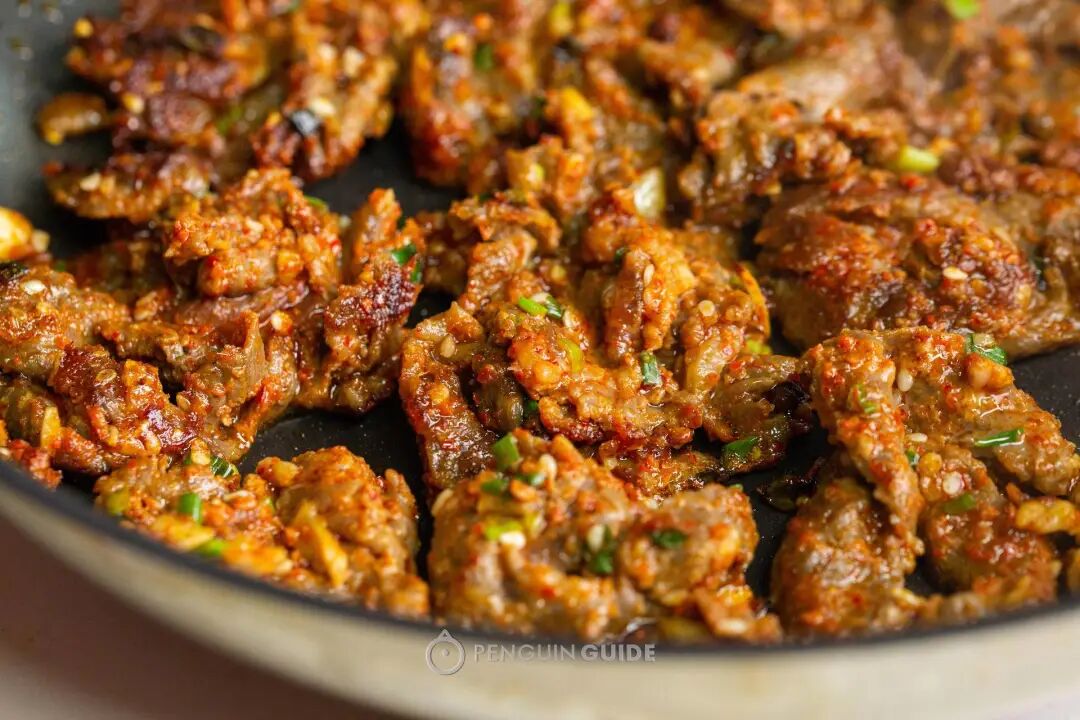 腌完后再次进入没有任何难度的“平底锅随便炒一下就好吃”环节,腌完的汤汁可以一起倒进去,小火慢炒大火收汁,5分钟搞定: